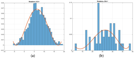 Symbols rotate by radians over the length of a block. This rotation must be kept to a small fraction of the quadrant that the symbols belong to. For example, in QPSK, each quadrant is radians. The proper block length is guided by the modality of phase histograms. A unimodal phase histogram with a distinct peak indicates that phase variations remain close to the nominal value, Figure 7a. For large , either due to large or long block length T, the histogram becomes multimodal with no distinct peaks, Figure 7b. Another disadvantage of large is the phase ambiguity where symbols move around the circle multiple periods.