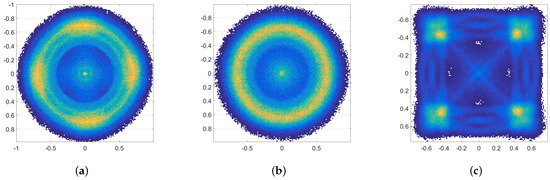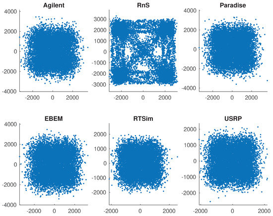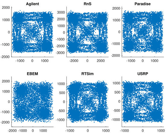 We now apply the proposed radiometric identification method to the signals generated by the following waveform generators or standards: Agilent [54], Viasat EBEM [55], Teledyne Paradise [56], KRATOS Real Time Channel Simulator (RTsim) [57], and USRP [58]. The data have QPSK modulation sampled at 2.95 MHz for a total of 35 million symbols per model. Figure 8a,b show signal constellations that are affected by varying amount of smearing. Figure 8b is a particularly sever case due to the large product causing symbols to rotate potentially multiples of . Following the estimation of and derotation of symbols, the original constellation is restored in Figure 8c. Figure 9 is a close up of six constellations after all phase and frequency offsets have been removed. The task now is to attribute the signals to individual sources. Given the similarity of the constellations in structure and features, it is clear that radiometric identification is a much more challenging problem than conventional signal classification based on modulation information.