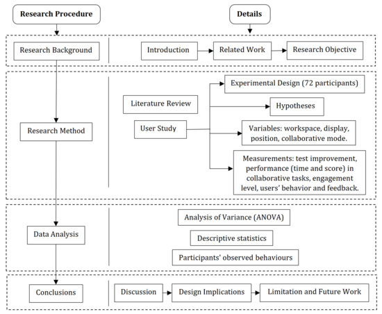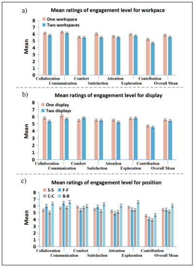 In the context of collaborative learning with large displays, existing research has explored the design of interface and software supporting learners outcomes [32,33,34] and the arrangement of learning content [35]. Understanding how various system features impact teamwork can better lead to a general improvement of users learning outcomes. Similarly, identifying display factors that can be controlled would allow comparisons across collaborative systems and help elucidate their influence on collaborative processes. However, there is still a gap in the literature exploring how multiple displays and their embedded virtual workspaces, whether assigned to each individual or the whole group, impact the collaborative process and collaborators’ behavior.