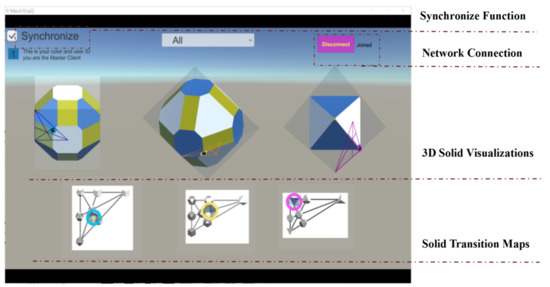 The tool has been developed in Unity3D [63]. As a visualization tool, users can explore and analyze using the tool’s visual interactive functions to interpret the results and draw their own conclusions [64]. No direct or explicit instructions about how to interact with the tool are provided. As shown in Figure 2, the interface of the tool is implicitly divided into four sections: (1) 3D solid visualizations: There are three base solids, cube, tetrahedron, and octahedron (for further details in Section 3.2); (2) Solid transition maps (STM): They can support navigation (movement) within each map and across maps. Within each map, thumbnails of regular solids are connected by lines to indicate the transitional processes of how they can be derived from each other (see Section 3.2); (3) Synchronize function: The transformation of the three solids can be synchronously-linked, and as such changes in one solid are reflected in the others (more details in Section 3.3); and (4) Network connection function: to allow users to switch between Shared and Non-Shared modes by clicking the “Connect/Disconnect” button (see details in Section 3.4).