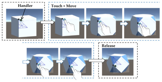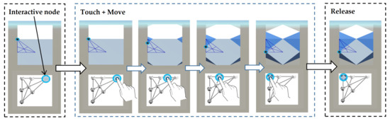 (1) Direct manipulation. Users can directly control the the handler (the black dot) on the solids and move it around to reach the desired object (see Figure 3). Direct manipulation gives a more direct engagement with an visual object [60,65,66]. The blue colored sides show the vertices that have been cut off (or truncated). On a corner of each base solid, there is a modified solid transition map that shows the current stage of transformation of this solid. The truncating/augmenting operations of users on the solids are constrained in the area of the map. This means that users can control the black dot handler on the solids and move it around on the map on the corner of each solid.