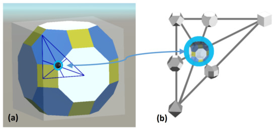(a) Rhombi-truncated cuboctahedron obtained by truncating all the vertices and edges of a cube; (b) Solid transition cube-map indicating the current state of the transformed solid.