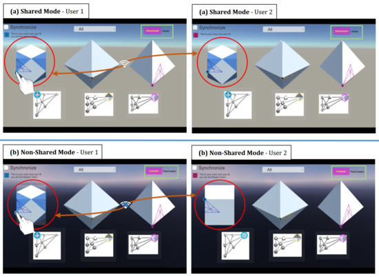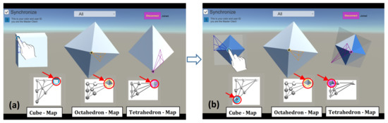 Screenshots of synchronization function: (a) One user manipulates the cube to get an octahedron shape; and (b) when it reaches the desired object, the same resulting object is displayed in the other solids (i.e., the octahedron) as the visual elements are dynamically linked (in our case implemented as synchronization).