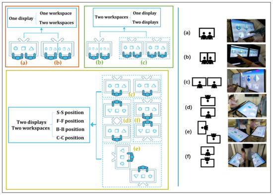 (3) Position arrangement: comparing Side-by-Side (S-S), Face-to-Face (F-F), Corner-to-Corner (C-C), and Back-to-Back (B-B) positions. With multiple displays, each user in a pair would have a single private display and workspace. Therefore, for two displays, we explored how paired users placed at various positions affect their task performance and experience. We considered four positions, S-S, F-F, C-C, and B-B as shown in Figure 8c–f (see the Yellow box in Figure 8).