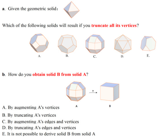 To determine knowledge improvement before and after interacting with the tool, participants were required to complete a test before engaging with the tool and the same test after. The test consisted of 12 questions based on the transformational and structural properties of the solids. Participants were asked to select the correct answer among several possible choices. Figure 9 shows two sample questions. For example, Question b asks participants to determine what interaction operations (truncating or augmenting) are required to obtain Solid B from Solid A. Each question, when answered correctly, was given one point (that is, 12 points in total). Two users were required to complete the test independently without any communicating with each other.
