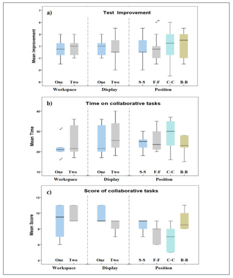 Figure 6a shows the distribution of the scores of the pre- and post-experiment tests based on the different conditions. One-way ANOVA yielded no significant differences (F = 0.298, p = 0.590, = 0.013, observed power = 0.082) on test scores between one shared workspace (M = 0.417, SD = 1.564, SE = 0.432) and two separate workspaces (M = 0.750, SD = 1.422, SE = 0.432). There was no significant difference (F = 0.015, p = 0.903, = 0.001, observed power = 0.052) between one single display (M = 0.750, SD = 1.422, SE = 0.411) and multiple displays (M = 0.667, SD = 1.875, SE = 0.541). For the position arrangements, although participants in B-B achieved the highest scores (M = 1.167, SD = 2.406, SE = 0.694), and F-F the lowest (M = 0.500, SD = 2.067, SE = 0.597), we did not find any significant difference in scores based on positioning.