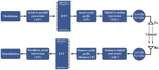 As can be seen from Figure 1, OFDM uses multi-carrier modulation to modulate the signal into multiple sub-carriers, and information can be transmitted over multiple carriers simultaneously [28]. Therefore, OFDM can be used to send more information in parallel with higher frequency band utilization. Introducing cyclic prefixes as protection intervals during OFDM propagation. In the case where the protection intervals is greater than the maximum multipath delay extension, not only can the inter-symbol interference brought by multipath be maximized but also the inter-channel interference brought by multipath can be avoided. These advantages make OFDM an important technical basis for wireless sensing of Wi-Fi signals.