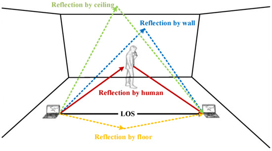 When Wi-Fi signals are propagated in indoor spaces, they are affected by objects such as walls, ceilings, floors, tables and chairs, causing reflection, scattering and refraction of signals. These reflected and scattered signals will reach the receiver later in time compared to the signals in the direct path. Therefore, the final signal received by the receiver is the superposition of all path signals, which is the multipath effect [30]. According to the above principle, when the Wi-Fi signal touches the human body in the process of propagation, reflection, scattering and refraction will also occur, as shown in Figure 2.
