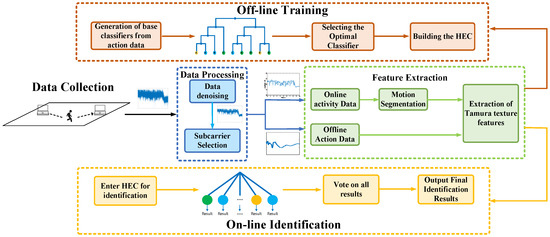 The CSI action data for each daily action is first collected on a commercial Wi-Fi device. In the data processing stage, to remove the interference of noise, we first use median filtering to remove outliers and then we uses Butterworth low-pass filter to remove ambient noise. After that, wavelet transform is used to smooth the data of each daily action. In the feature extraction stage, if the input data is off-line action data, the texture feature is directly extracted; if it is online activity data, the action segmentation is performed first and then the feature extraction is performed. In the off-line phase, three classifiers are constructed as base classifiers, and then the three classifiers are clustered using hierarchical clustering, and the best classifier in each cluster is selected according to the AUC and then integrated to form the final classifier and trained with the collected samples. After collecting the data in the online stage, the data are processed identically and fed into the classifier to output the final action classification results.