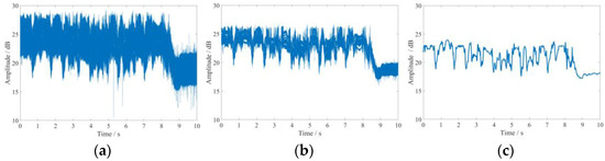 Figure 5. Motion data processing: (a) CSI raw motion data; (b) signal denoising; (c) subcarrier selection.
