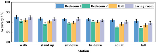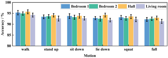 To further validate the performance of Wi-CAS, the transmitter and receiver were set up at location 1 and location 2 marked in Figure 9, and the experimenter was asked to perform the corresponding activities in the above four scenarios to verify the performance of Wi-CAS in the presence of wall obstruction. The action recognition rate of each scene is shown in Figure 11.