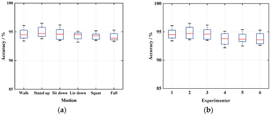 As can be seen in Figure 12a, Wi-CAS has a high recognition rate for different actions of the same person. In Figure 12b, experimenters 1–3 are males and the rest are females. From the experimental results, it can be seen that the action recognition results of males are slightly higher than those of females. This is due to the fact that the size of males is slightly larger than that of females, so the amplitude and range of the actions are larger, and the impact on the CSI is more obvious, so the action recognition rate of males is higher. In summary, the action recognition rates of different experimenters were above 90% in all three environments. It proves that Wi-CAS has high robustness to different users in terms of individual action recognition.