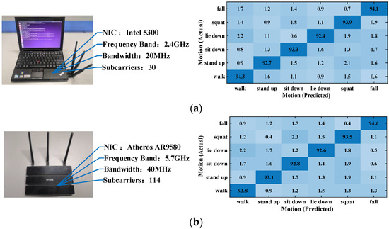 Portability is also an important measure of system performance. So, we tested it on Intel 5300 NIC platform and Atheros NIC platform respectively. The Atheros NIC platform consists of two TP-Link routers equipped with Atheros AR9580 NICs. The motion data were collected from the two platforms separately for comparison after processing using Wi-CAS. Figure 14 shows the parameters and action recognition results of the two NIC platforms.