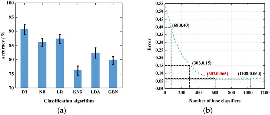 The recognition accuracy of the ensemble classifier also depends on the performance of the individual base classifiers. Therefore, the performance of different base classifiers was first compared. We compared Decision Tree (DT), Naive Bayesian (NB), Logistic Regression (LR), k-Nearest Neighbor (KNN) classifier, Linear Discriminant Analysis (LDA) classifier, and General Bayesian Network (GBN) classifier. The comparison results are shown in Figure 15a.
