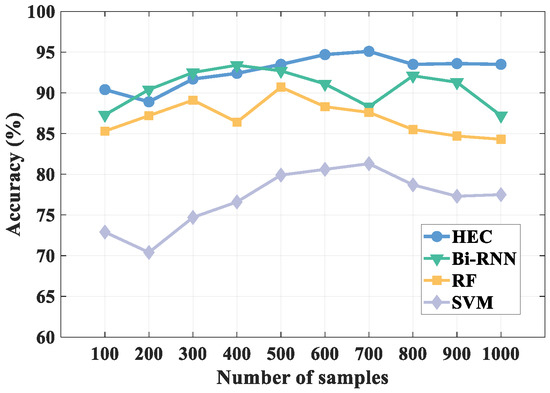 As can be seen from the figure, compared with other algorithms, HEC always maintains a high recognition accuracy as the number of samples increases. The recognition result of HEC is the highest when the number of samples hits 700, and after that, the recognition result gradually remains stable as the number of samples increases. Therefore, HEC shows the best performance when the number of samples hits 700. Besides, although the method using Bidirectional Recurrent Neural Network (Bi-RNN) also has high recognition accuracy, the method gradually performs unstable as the number of samples increases, so from this point of view HEC has higher recognition performance.