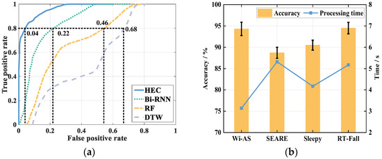 From the comparison results, it can be seen that when the True Positive Rate (TPR) reaches 0.8, the False Positive Rate (FPR) of HEC is only 0.04, which has the best performance, and the FPR of Bi-RNN is 0.22 which is slightly lower than that of HEC. The FPR of DTW reaches 0.68, which has the worst performance. From the comparison results, we can see that HEC has the best performance, higher than Bi-RNN algorithm. DTW has the worst performance. Compared with the three algorithms, HEC has a better performance. In addition, we have validated all the algorithms proposed in the literature [23,24,25]. The comparison results are shown in Figure 17b.