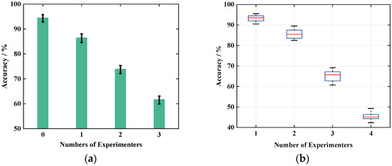 Home isolation does not always entail being isolated alone, as more often two or three people isolated at the same time. Therefore, when there are people doing other actions to interfere or multiple people doing actions at the same time, whether the system performance can be accurately identified is an important criterion. Accordingly, we set up four experimenters to verify two aspects of interference and simultaneous actions of multiple people. First of all, we investigate the influence of the number of interferers, let one experimenter do the action, and add one, two, three interferers respectively, the interferers do other actions in the room to interfere, and compare the recognition results with the results without interference, the comparison results are shown in Figure 18a. After that, 2, 3 and 4 experimenters were set up to perform the same action at the same time, and the results were compared with those of 1 person doing the action to compare all the data using the above classification method respectively. The experimental results are shown in Figure 18b.