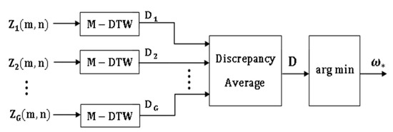 The DTW classifier that uses the GMI model is illustrated in Figure 7. In this input-level fusion approach, the system has one M-DTW classifier to classify the global inter-sensor matrix. The discrepancy scores between a test movement and reference movements are computed and the test movement is assigned to the class which yields the smallest score.