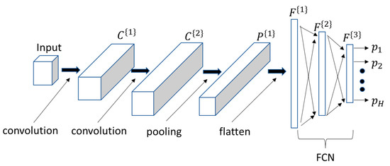 A typical CNN has an input layer, an output layer, and hidden layers consisting of convolution, pooling, and fully connected layers. The network architecture is defined by the number and arrangement of the convolution and pooling layers. Figure 8 is an illustration of a CNN with two convolution layers and followed by a pooling layer and a FCN with layers , , and (output layer). The input to the first fully connected layer is the flattened (concatenated) output from the pooling layer. In general, the dimension of a convolution layer depends on the number of convolution filters, the filter stride, and the type of convolution (valid or same). A pooling layer dimension depends on the size and stride of the pooling filters. For classification problems, the output layer is typically a softmax layer with one output for each pattern class. The network is trained using the gradient descent backpropagation algorithm.