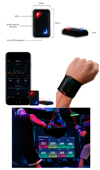 The research executed in this investigation has led to the design, fabrication, and commercial translation of a complete IoT sensor system for smart boxing. Our design reflects the evolution of wearables from a ‘device’ to a ‘systems’ perspective [9], and consists of original sensors, embedded code, apps for use with a smart phone for data collection, and cloud computing for data storage and visualization. The system, shown in Figure 18, has been released as a commercial product by Corner Wearables based in Manchester, UK. It was first trialed with the boxing team at Imperial College London and subsequently expanded into a full product for sale worldwide. The integrated system consists of a small sensor in the boxer’s hand wraps that fits under boxing gloves. All code for punch identification is embedded onboard with a microcontroller to detect and classify movement history, which is sent via Bluetooth to a smart device for display and storage through an app on a smart phone. The embedded code performs all pattern classification hence transmission is only necessary for statistics saving the need to send raw data over Bluetooth. The first-generation commercial system tracks 6 classes of punches (dominant hand–cross, hook, uppercut, non-dominant hand–jab, hook, uppercut). Subsequent releases will classify the full 18-class problem outlined in Section 6 using the full deep learning architecture outlined in this investigation. Corner, featured in IEEE Spectrum [57], is the first ever smart boxing tracker which does not need polarized (left-right specified) sensors. It was recently assessed in a boxing study as a part of this special issue of Sensors [58] as having the capacity to track both beginners and experienced boxers, though beginner punches are less consistent due to immaturity of technique. Thousands of devices are currently in use, providing an intriguing database for analysis in future work. The commercial system has also been used in live boxing matches, including the World Series of Boxing, to provide real-time statistics to spectators, judges, and trainers to evaluate match performance.