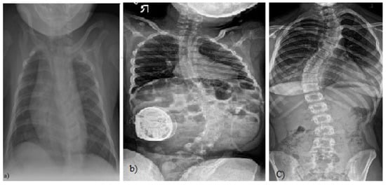 (a) A 4-month-old boy born small for gestational age, at 37 weeks, who presented initially with asymmetry of both the left and right aspects of the anterior and posterior chest and confirmed thoracolumbar scoliosis and vertebral anomalies based on plain radiography with a Cobb angle measurement of 30 degrees, (Case courtesy of Sonal Desai, Radiopedia.org, rID: 63310 under Creative Commons License (CC BY 3.0).) [5]; (b) X-rays of a girl with juvenile idiopathic scoliosis, (Case courtesy of Dr Jeremy Jones, Radiopaedia.org, rID: 89566 (CC BY 3.0).) [6]; and (c) severe left thoracic adolescent scoliosis, (Case courtesy of Dr Jeremy Jones, Radiopaedia.org, rID: 89456 (CC BY 3.0).) [7].