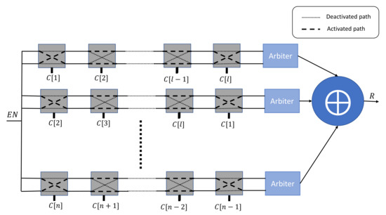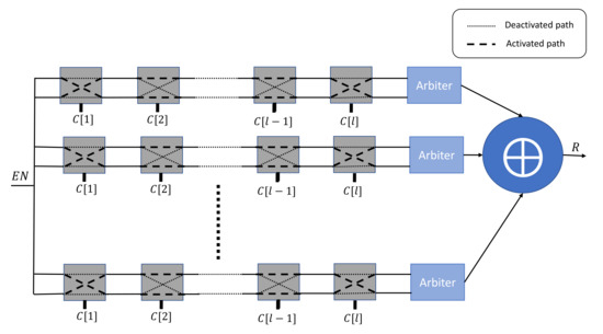 The Arbiter PUF [30] is one of the most popular electronic PUFs that are exploited for authentication operations. This PUF’s architecture is based on a comparison of the travel times of two electrical signals propagating down two symmetrical paths. The uniqueness of the responses is based on the manufacturing variations in the creation of these two paths. This PUF is constructed using a pre-determined number of 22 cells that connect these paths. The choice of connection routes depends entirely on the l challenge bits . Finally, the arbiter component decides which signals has arrived first, and accordingly outputs the associated binary response, as illustrated in Figure 1.