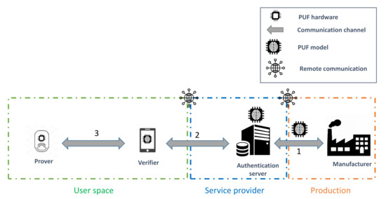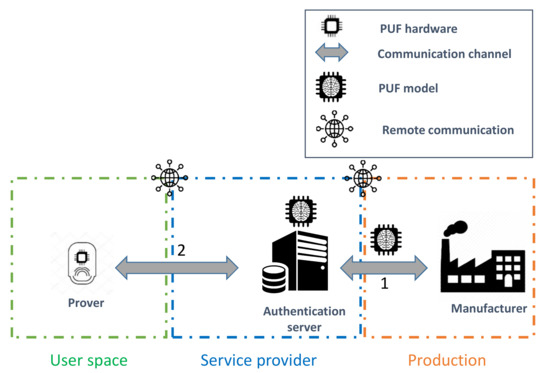 The manufacturer plays the initial role of constructing the prover hardware. He extracts enough challenge–response pairs to construct the PUF model and he sends it securely to the authentication server. These actions mark the end of participation of the manufacturer in the enrollment process.