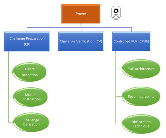 The application of a PUF ML model in the protocol design is an admission that this secure element can be mathematically cloned when the adversary has a sufficient number of challenge–response pairs. Therefore, additional protection techniques should be implemented to prevent the attacker from constructing their own precise PUF model. Following the specifications in the work of Maes [51], the added security measures classify this PUF construction as a Controlled PUF. The prover role is established based on three main elementary units, as highlighted in Figure 9, that manage the input–output transformation. The three sub-components are as follows: