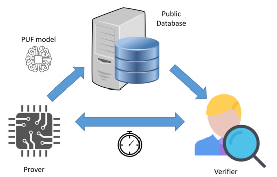 - Authentication server (AS): The entity that manages the storage and the accessibility to the PUF model. Furthermore, it performs the enrollment procedure with the prover as the root of trust (RoT) [50] in the authentication process through the chosen communication channel.