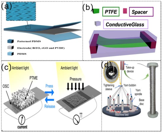 (a) Schematic illustration showing the basic structure of tactile e-skin. Reprinted with permission from Ref. [85]. Copyright 2020 Elsevier. (b) Schematic diagram of ATNG sensor. Reprinted with permission from Ref. [86]. Copyright 2014 American Chemical Society. (c) Schematic diagram of the principle of PTSP and OSC sensors. Reprinted with permission from Ref. [87]. Copyright 2020 Elsevier. (d) Schematic diagram of multi-shaft yarn winding machine. The enlarged picture in the upper left corner is a picture of the tightening sleeve and the bobbin wrapped with continuous multi-shaft winding yarn. Reprinted from Ref. [88].