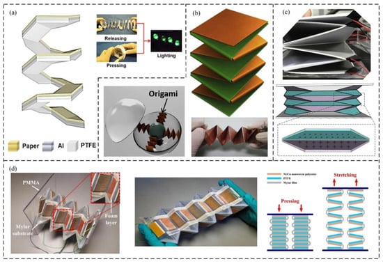 In addition to being affected by the overall device structure, the electrical output characteristics of current origami nanogenerators are also limited by the simple origami patterns used as the basis of TENGs. In response to this problem, an origami tessellation (OT) base was reported [122]. This OT base can be installed with multilayer friction pairs and can be driven by very little stimulation. Moreover, the increase in paper-based tribo-pairs could significantly enhance the electric output performance of the device. The application demonstration showed that OT-TENG has potential in the future energy demands of intelligent transportation (Figure 8c).