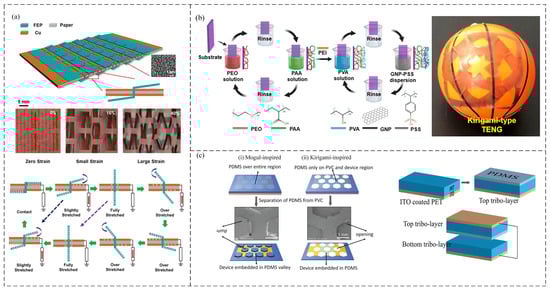 In addition, a polymer matrix with a kirigami structure can enhance the stretchability of a TENG. A self-powered stretchable wearable photodetector was developed using a kirigami-based honeycomb structure of zinc oxide nanowires and coupled with a TENG [125]. Embedding this device into a PDMS substrate with a kirigami pattern of honeycomb geometry showed outstanding stretchability with strains up to 125% (Figure 9c).