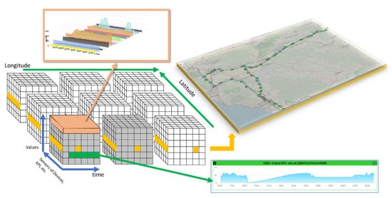 As to the state-of-the-art analysis, its final aspect is data access and data rendering/visualization. These aspects must be addressed at the same time. OLAP (online analytical processing) [40] can be the starting point since each IoT device, associated with a data model and source, can be a hypercube with several axes. See for example Figure 1, which illustrates a hypercube with axes such as space (latitude and longitude), time, and variables with values of different kinds/units (e.g., numbers, enumerate, and strings). Figure 1 shows possible views: multi-series, multiple values on the same trajectories over time and territory, and time trend of a time series, which can be obtained from sliding or dicing the hypercube. These effects can be easily obtained if data are aligned in terms of characterization, geoinformation, and temporal values.