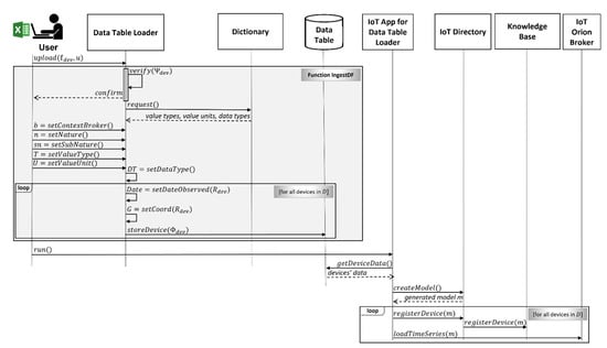 The data loader is based on four main components supporting the above-listed requirements, and it is described in the following section. The whole process is described by the sequence diagram reported in Figure 3. It clarifies interactions among different entities: user, data table loader, data table, and IoT app, with respect to the former Snap4City architecture components.