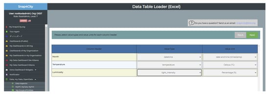 Figure 4 shows the user interface of the data table loader. The screenshot is taken in the phase when value types and the value units are associated with IoT device model features (see the column headed Column Header), while data types are provided automatically on the basis of the dictionary. Access to the data table loader, implemented in Python, is granted to authorized users. In addition, for each authorized user IoT apps are also provided as Docker containers, executed on the cloud-based scalable Snap4City platform [15]. The cloud-based Snap4City IoT apps are managed on a cluster of Marathon Mesos virtual machines (VMs), each of which may manage up to IoT Apps. When more IoT apps are needed a new VM is deployed [44].