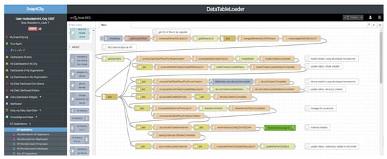 Once the data table is generated, specific IoT apps are activated to commit the actions on the Snap4City platform [15]. IoT apps address separate processes for ingesting IoT devices and POIs. These processes, which are implemented as Node-RED (actually Node-RED plus Snap4City MicroService Libraries), get access to the users’ data table and start an automated process. It includes (according to the identified data): (i) the creation of one or more IoT device models, (ii) the registering of IoT device instances, and (iii) loading data messages of time series of the IoT device’s corresponding historical data.