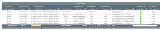 In the wizard search table different data sources are represented by a specific high-level type (HLT) (e.g., POI, IoT device, mobile device, data table, and KPI). Then, nature, , and subnature, , represent information about IoT, POI, or any other data source semantic category. Moreover, regarding IoT devices further information is shown, such as the feature name (, represented by the “value name” column in the Dashboard Wizard table, as shown in Figure 6), value type, , value unit, , data type, , the last value, , and the last date–time, . Information about both the user, , and the organization, (), are automatically handled depending on the logged user account, and this determines which data can be viewed in Dashboard Wizard loading (that is, public data as well as logged user’s own and delegated data).