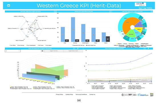 (a) Dashboards representing data collected by exploiting the data ingestion tool according to the Φdev formal model: KPIs related to tourism flows data in western Greece; (b) details of OLAP data cube widget time slicing; and (c) stream graph.