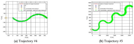 The number of position iterations depended on the number of simulated position reports in individual simulated tracks. Trajectories present the data simulated from five different maneuvering vessels in various ways to check the possibilities of the algorithm estimating its coordinates. The speed of the ship during the simulation was 4.5 knots. The trajectories of the vessels are presented in Figure 2 in Section 3. Sea state 0, wind −1°B northward N.