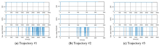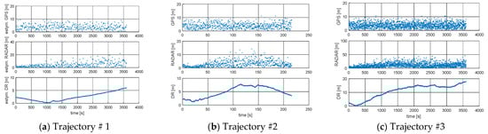 RMS of DR positions, RMS of RADAR positions, and RMS of GPS positions: (a) Trajectory #1; (b) Trajectory #2; (c) Trajectory #3 [researchers’ elaboration].