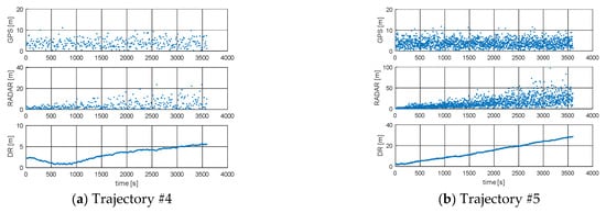 RMS of DR positions, RMS of RADAR EKF-SLAM positions, RMS of GPS positions: (a) Trajectory #4; (b) Trajectory #5 [researchers’ elaboration].