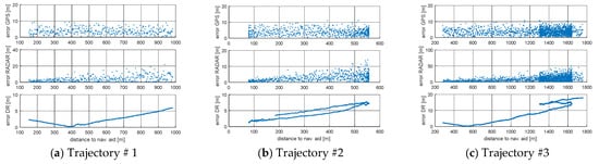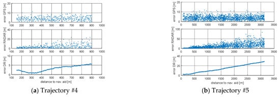 The Root Mean Square (RMS) for simulated positions and GPS, RADAR or DR positions are presented in Figure 4 and Figure 5 and Table 2. Figure 4 and Figure 5 present the error values of the ship’s position as a function of time. Figure 6 and Figure 7, on the other hand, show the position error values as a function of the distance from the navigation aid.