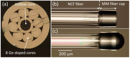 The hollow-core NCF was fabricated using the stack-and-draw technique [,], and the cross section of the fibre is shown in Figure 1a. A more detailed description of the fibre design, fabrication, and characterization, including the transmission properties, can be found in []. The inner region consists of a single ring of six silica capillaries around a hollow core. The hollow core is designed to guide the 785 nm excitation light. In addition, surrounding the hollow-core, we introduced a ring of Ge-doped cores (peak NA = 0.3) designed to collect the Raman signal from a distal sample and therefore to increase the collection efficiency of the probe.