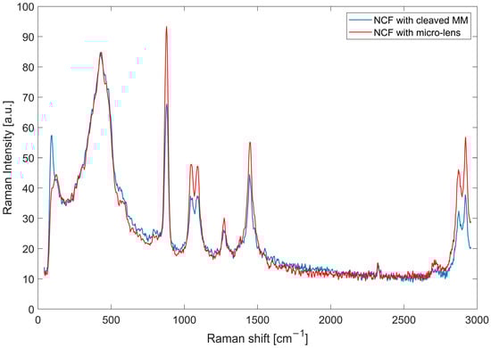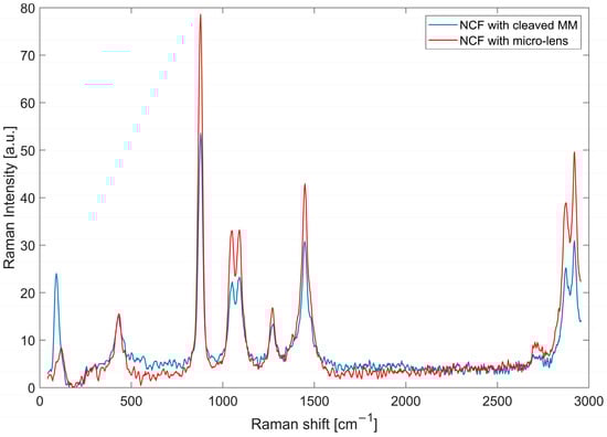 The background spectrum measured in water was removed and a seventh-order Savitzky–Golay smoothing filter was applied (Figure 4). The result shows a significant Raman signal improvement when using the micro-lensed fibre. The 878 cm−1 peak has about 1.5-times higher intensity. Similar enhancements are seen for other lines. The higher Raman signal measured with the micro-lensed probe is related to two effects. The micro-lens focuses the excitation beam to a smaller volume, resulting in higher power density in the sample region within the volume in the collection fibre’s fields of view.