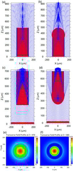 To illustrate the improved performance using a micro-lensed probe we used BeamPROP (RSoft, Synopsys, Mountain view, CA, USA) to simulate light propagation and coupling to a cleaved and a micro-lensed capped NCF. Figure 5a,b show the result using a 785 nm Gaussian beam excitation at z = 0. As expected, the micro-lens focuses the excitation beam into a smaller sample volume. The result is a larger number of Raman-shifted photons in the probe’s field of view. In Figure 5c,d the simulation has been reversed, using three Gaussian beams at z = 0, separated by 15 μm, to simulate the generated Raman signals. The light collected by the micro-lensed fibre was focused inside the fibre allowing for more light to be efficiently coupled back to the NCF and Ge-doped cores.