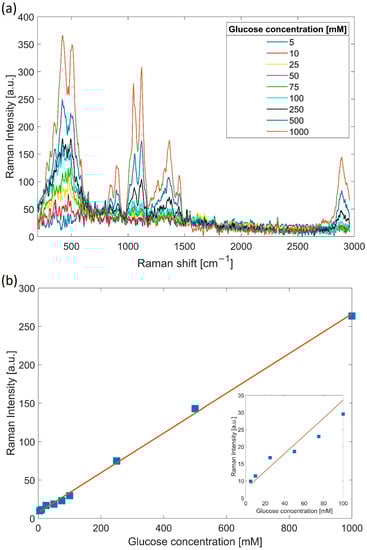 (a) Measured Raman spectra for different glucose concentrations; (b) 1120 cm−1 peak intensity as a function of the glucose concentration in mM (blue points) and linear fit (red). Insert: closeup of concentration range 5–100 mM.