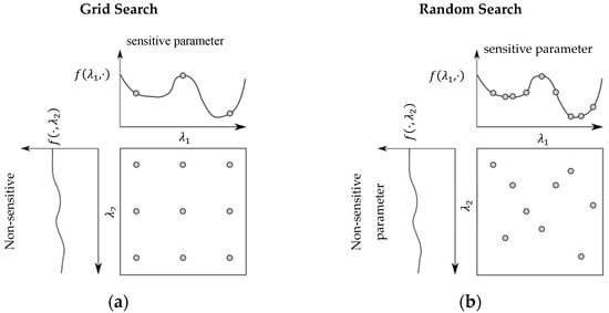 The Random Search (RS) was first introduced by Rastagan in 1963 []. RS is an extension of the Grid Search (GS) where a predefined number of parameter sets are randomly selected on the entire search space. The advantage compared to the GS is that the parameter space is much better covered since the individual parameters are less often evaluated on the same values. This is especially the case when one or more parameters are more important than others, as shown in Figure 3. The left axis is the graph of the cost function for the different values of a non-sensitive hyperparameter. As can be seen, the cost function is approximately constant for all values, and a variation of this hyperparameter, therefore, leads to no or only a minimal improvement of the network.