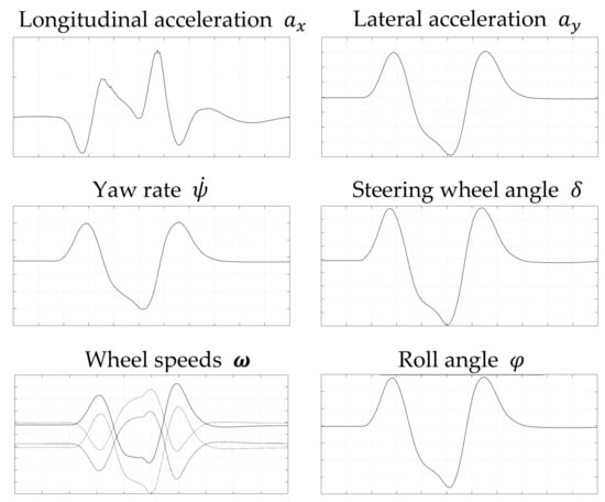 Figure 4 shows exemplarily the data for a double lane change maneuver. The longitudinal acceleration , the lateral acceleration , the yaw rate , the steering wheel angle , the wheel speeds and the roll angle are depicted.