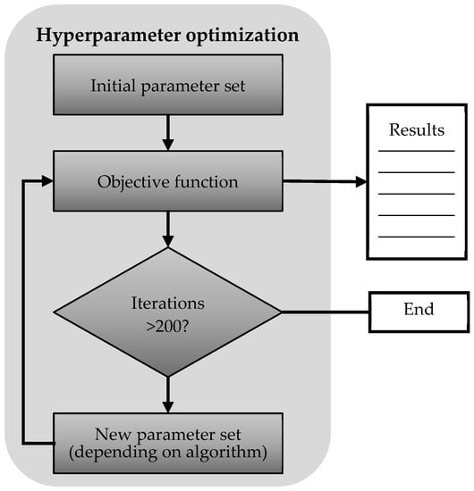 Figure 5 shows the schematic flow of a general hyperparameter optimization. All methods used here use this general principle and differ only in the determination of the new hyperparameter set. The RS and HB only generate random parameters that are not based on previous knowledge, whereas the GA and BO use additional information to generate new parameter sets (see Section 3). The initial and the newly generated parameter sets are evaluated by an object function, i.e., for each element in the parameter set an artificial neural network is generated and subsequently used to determine a predefined performance. The calculated performance for each element in the set is finally stored in a database.