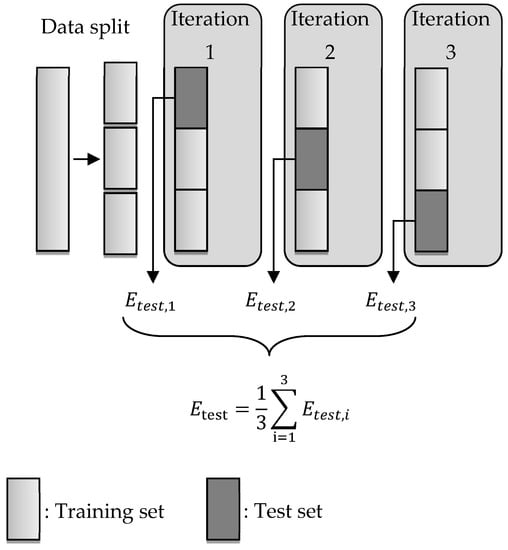 The hyperparameter optimization uses an objective function that performs a cross-validation to calculate the accuracy of the neural network. This means that the data is divided into k subsets and then each of these k subsets is used as a test data set. Thus, k runs are performed where the kth subset is the test data set, and the other (k-1) subsets are used as the training and validation data set. Figure 6 shows the 3-fold cross-validation that is used for this contribution. Firstly, the shuffled data set is split into three parts. Subsequently, three iterations are performed, where each subset is used once as a test data set. The other two subsets are again subdivided into 85% training data and 15% validation data. For each iteration, the root mean squared error (RMSE) is calculated as the objective function: